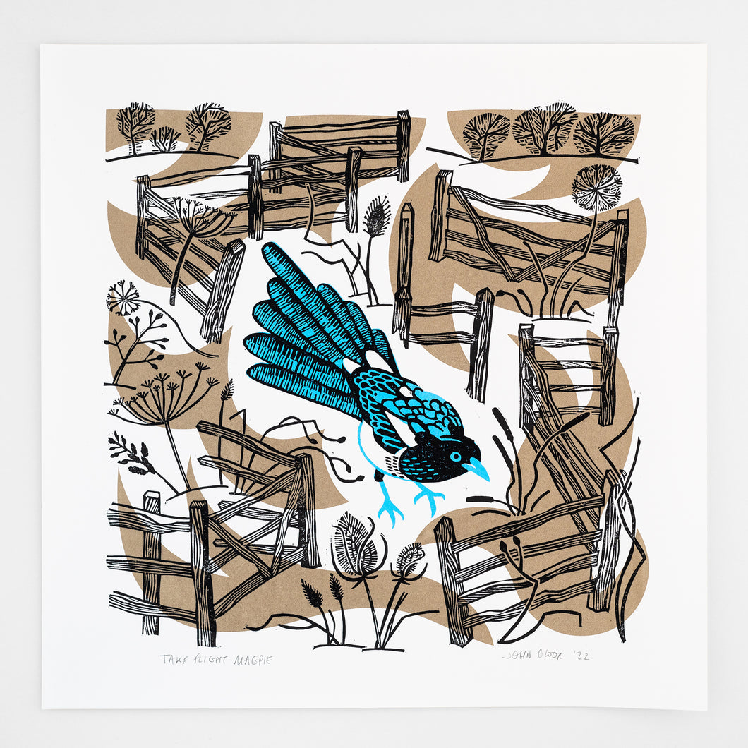 Take Flight Magpie handbedruckter Linolschnitt und Siebdruck