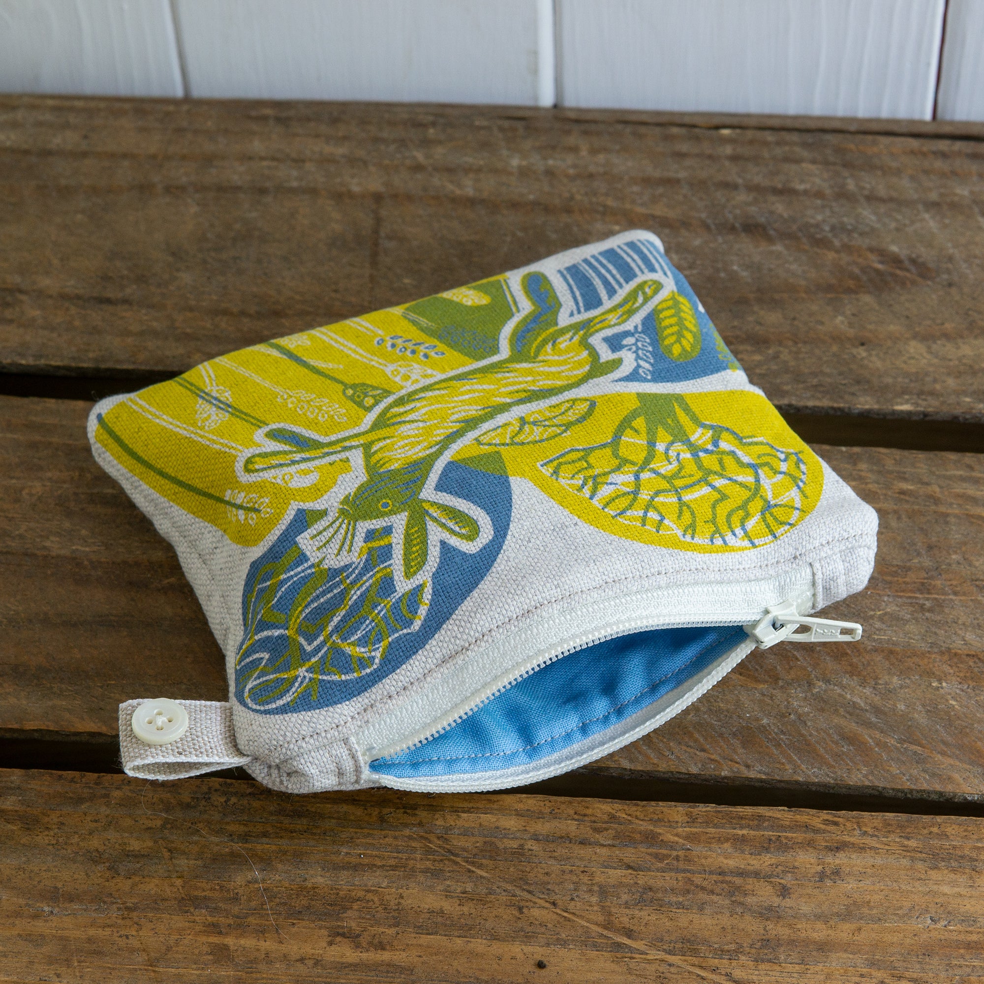 Alle Geldbörsen verfügen über einen Vintage-Perlmuttknopf auf einem Leinenetikett. Jeder Knopf ist einzigartig und hat eine kleine eigene Geschichte.