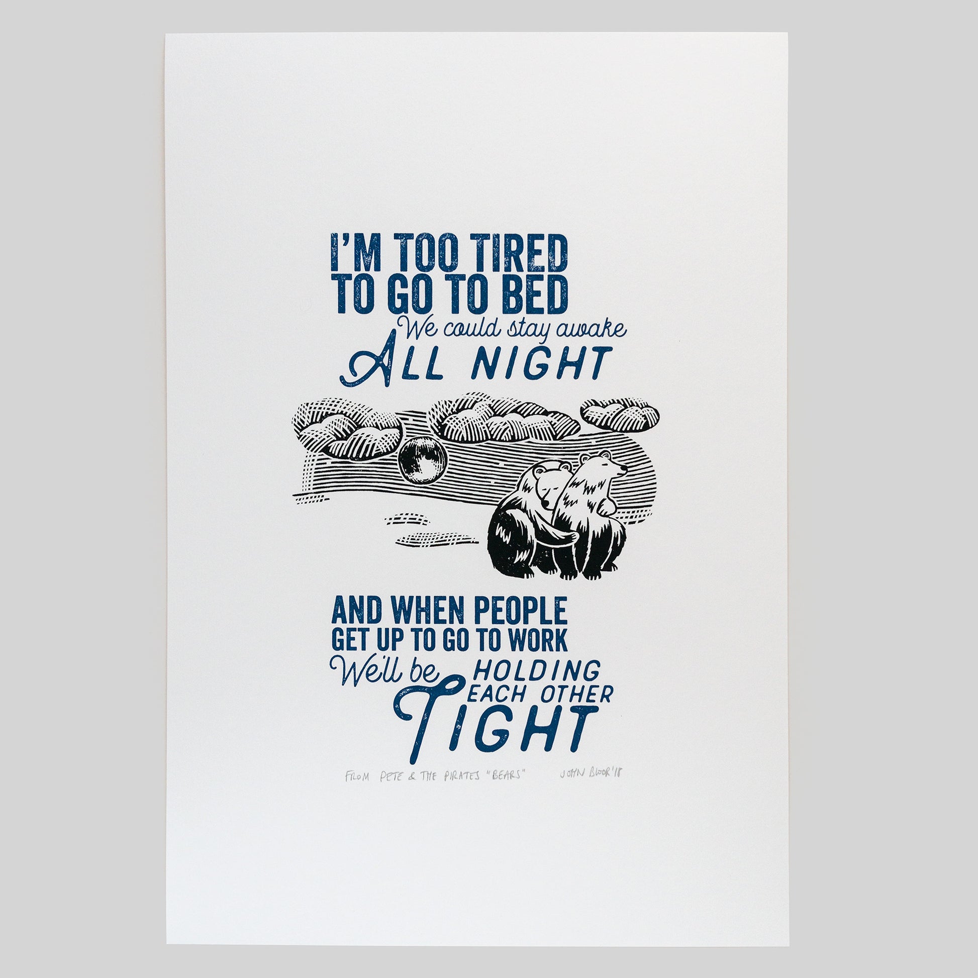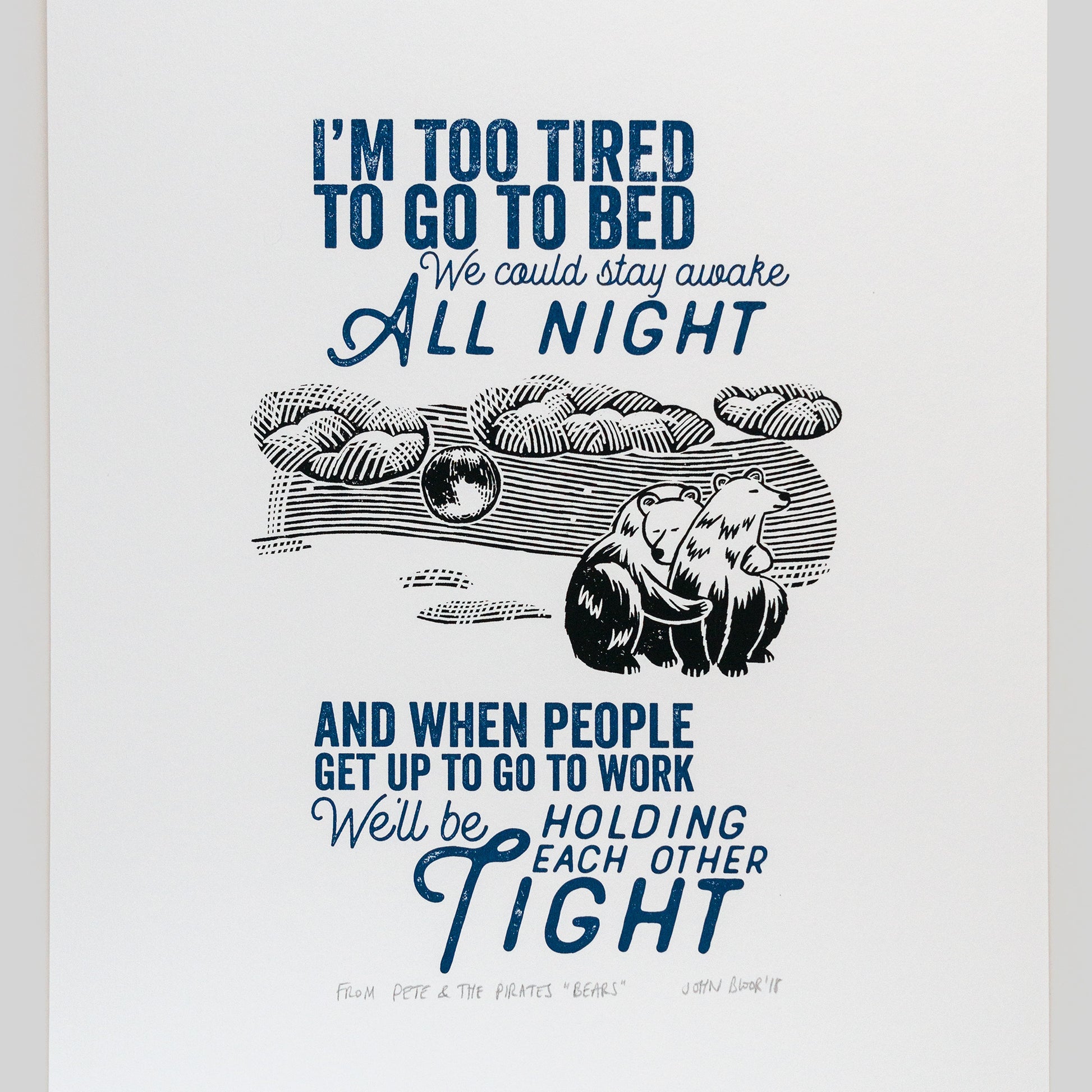 This "Bears" screen print is from a song lyric by Pete and the Pirates. Each one is titled and signed by me.