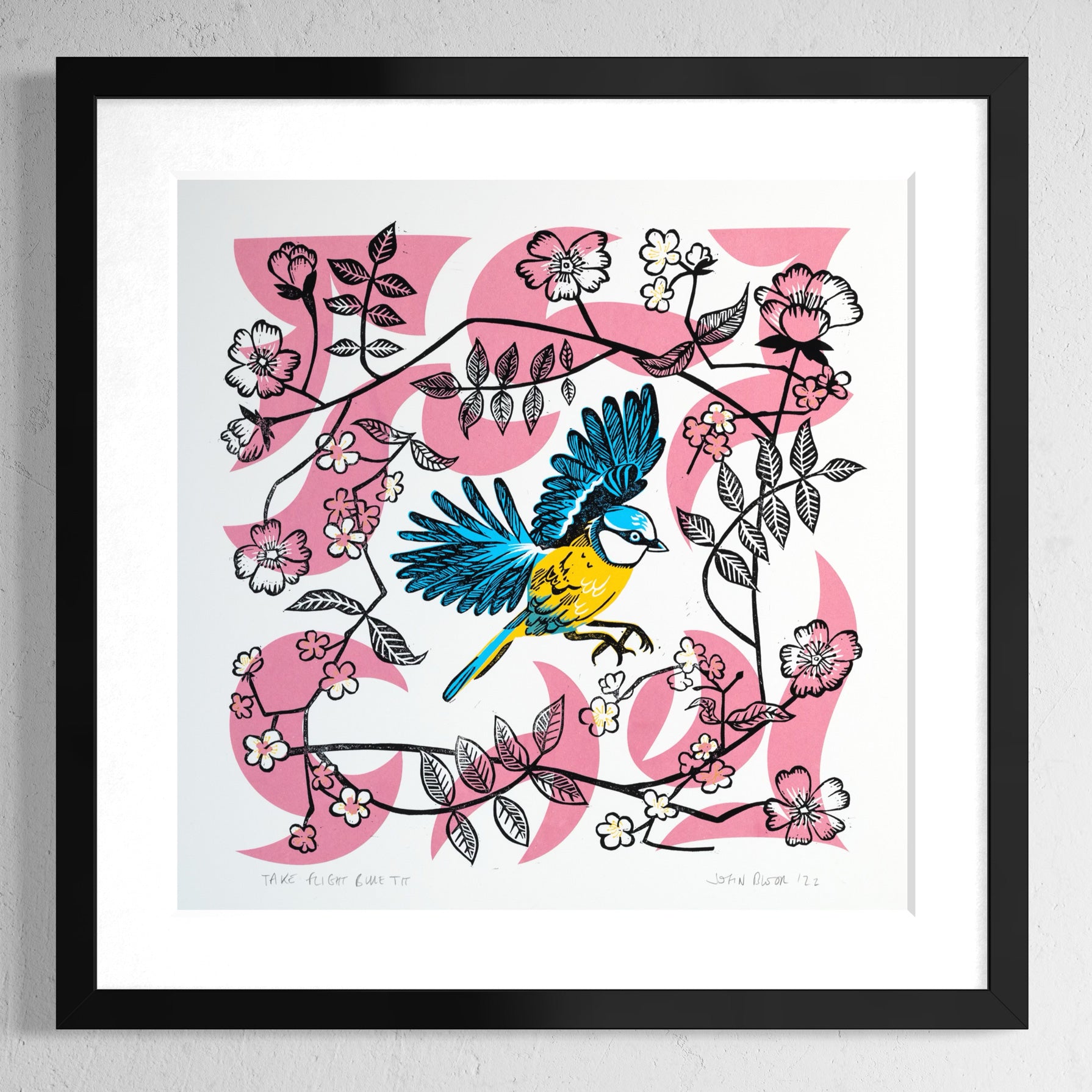Take Flight Blue Tit hand printed unframed linocut and screen print