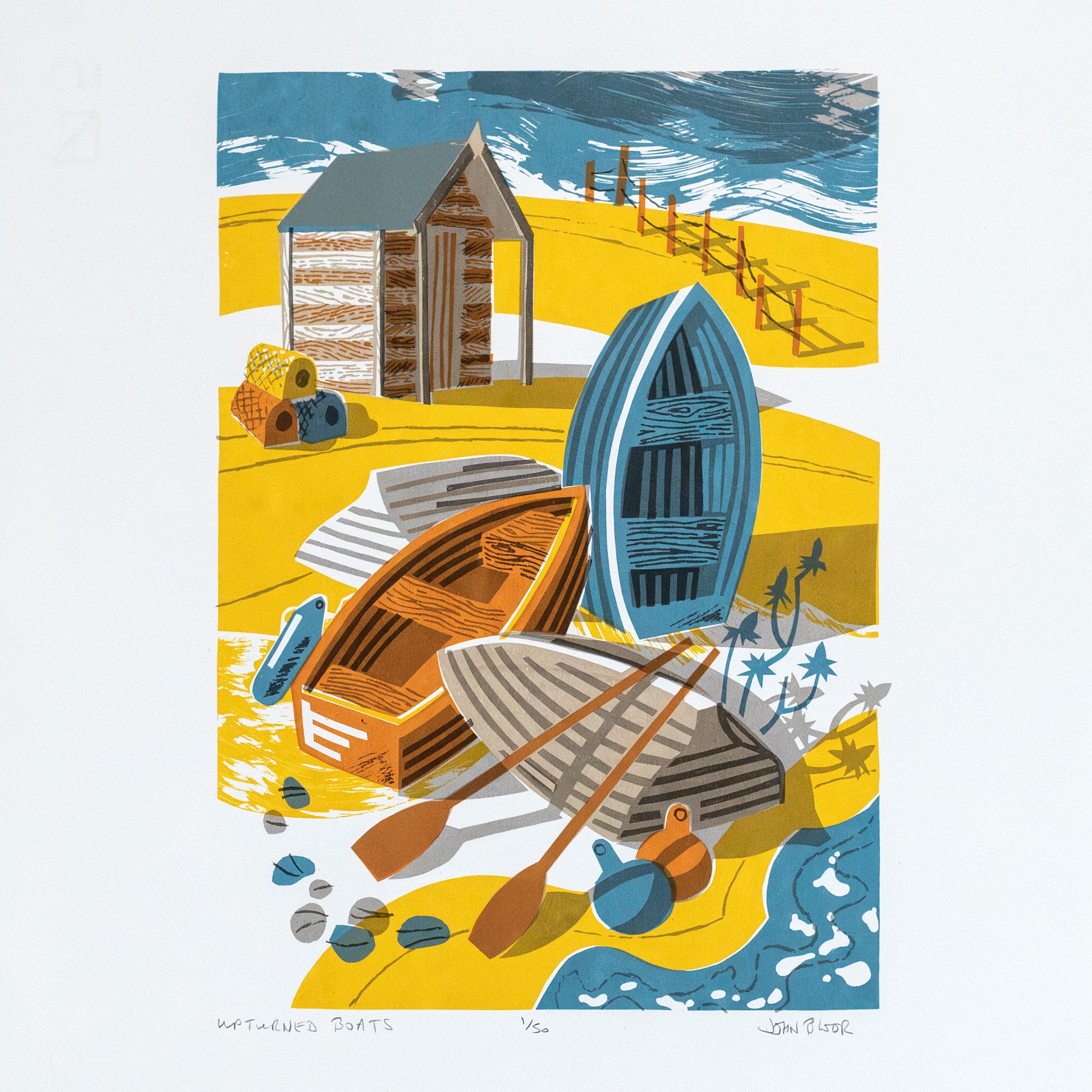 This Upturned Boats print is the first print I have made using hand made stencils. The stencils were made out of polyester paper which I painted black, pencil marks, pen marks and painted brush strokes. All these elements were then glued to a sheet of transparent polyester and turned into screens.